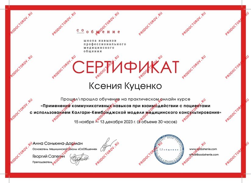 Мне кажется, что на приеме все прошло хорошо. Доктор провела тщательный осмотр, поставила диагноз и назначила лечение, которое дало результат. Мы приходили к ней повторно, и она нас выписала. Обратились к специалисту, потому что у сына был грипп​. Куценко К.И. полностью осмотрела ребенка, проверила уши, нос, лимфоузлы и живот, прощупала. По моему мнению, она аккуратно обращалась с ребенком. Я бы сказала, что у доктора было очень позитивное отношение, сын не боялся ее. Ксения Ивановна спрашивала у ребенка разрешение, можно ли посмотреть уши и нос, то есть врач нашла подход к нему. Она назначила нам антибиотик, подробно расписала, как его необходимо правильно принимать и выдала рецепт. Кроме этого, специалист давала дополнительные рекомендации. На мой взгляд, Куценко Ксению Ивановну, конечно, можно посоветовать другим людям! Отмечу, что выписанное лечение нам помогло.