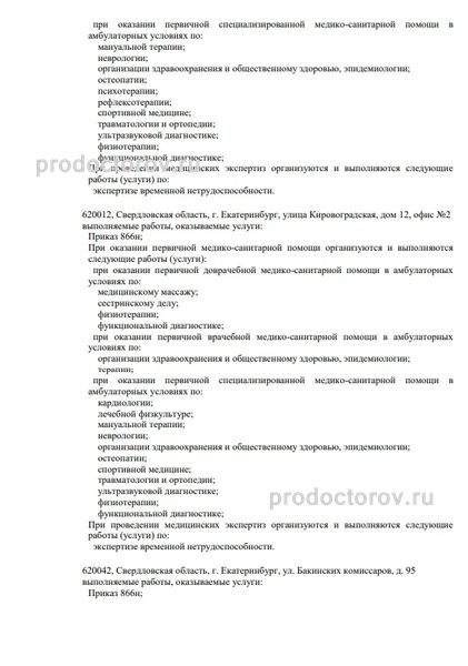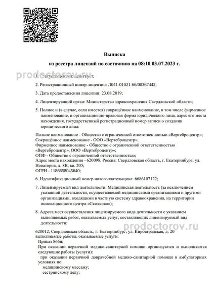 В штат компании «Вертеброцентр» на Кировградской 12 входят опытные и профессионально подготовленные специалисты. Свою медицинскую деятельность компания осуществляет в строгом соответствии с лицензией. Работу коллектива возглавляет главный врач Сюникова А. А. Прием пациентов осуществляется 7 дней в неделю: в будние дни – с 8:00 до 20:00, в выходные – с 8:00 до 17:00.