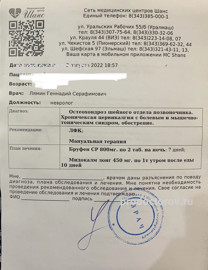 Обращался с остеохондрозом​ шейного отдела. Назначил доп. обследование и лекарства. Все помогло, теперь знаю проблему и как её устранить. Врач все объяснил и дал рекомендации по профилактике и лечению.