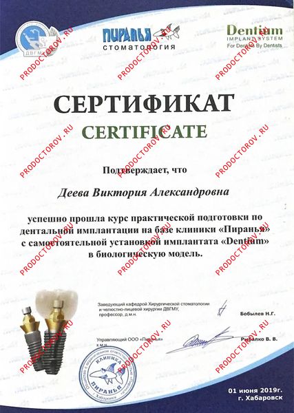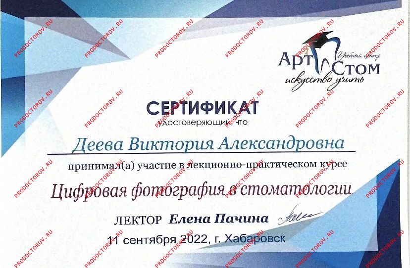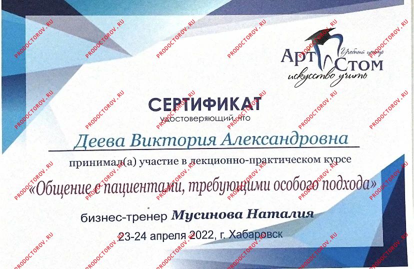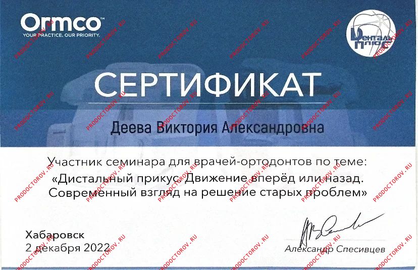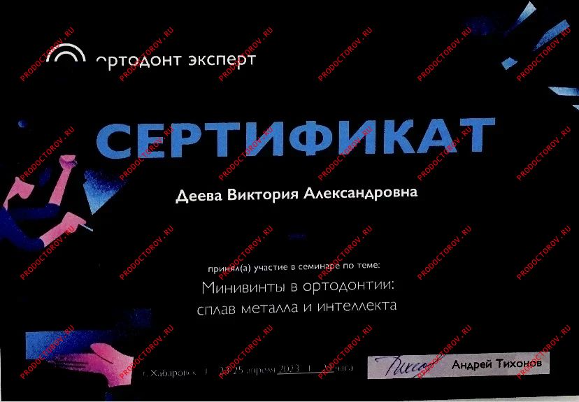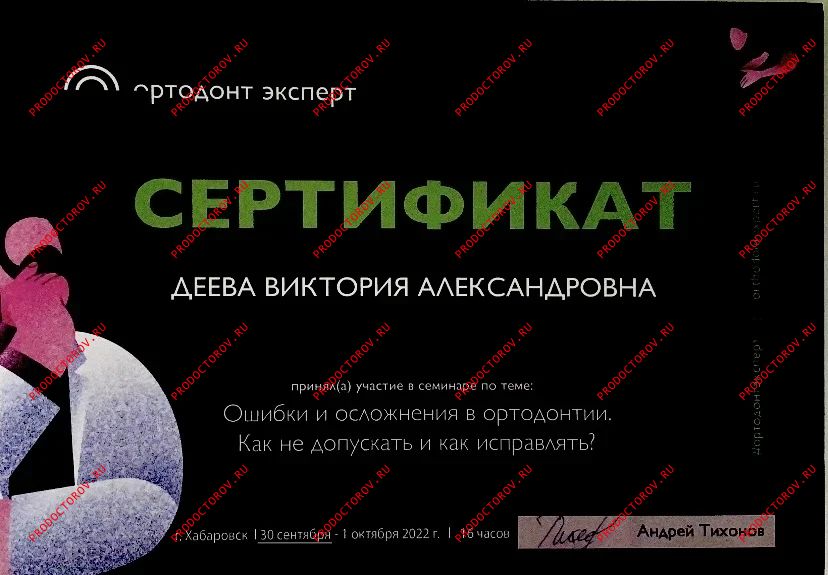 “Я рада рекомендовать коллегу Дееву Викторию Александровну как грамотного доктора которая работает в гнатологической концепции - а это, как врачу-ортодонту, просто необходимо, чтобы получить хороший результат и в дальнейшем избежать проблем в височно-нижнечелюстном суставе. Она выполняет очень сложную диагностику на таких аппаратах как [...] и интерпретирует результаты этой диагностики. Мои пациенты, кто лечился у Виктории Александровны, и я как доктор, который видит результат лечения - все мы довольны проделанной работой. Очень рада, что в нашем городе можно найти грамотного ортодонта, который будет лечить правильно. Данному доктору желаю дальнейшего совершенствования в своей нелегкой работе! С уважением, доктор Белокриницкая.”