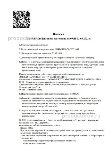 «Международный центр вакцинации», Иркутск: 7 врачей, 13 отзывов о клинике и ее врачах, цены от 100 до 5500 руб., телефон, официальный сайт, адрес - Иркутск, ул. Депутатская, д. 71а.
