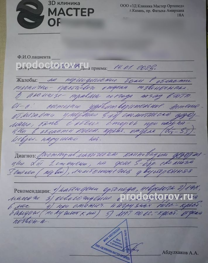 Решила обратиться к доктору Абдулхакову А. А. по отзывам. Обратилась с болью в позвонке.