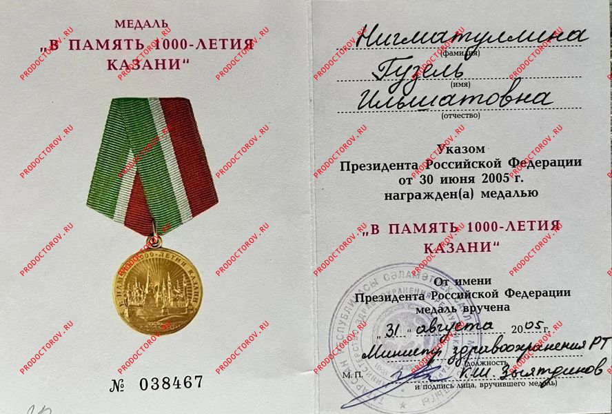 Медаль «В память 1000-летия Казани», награждена Указом Президента Российской Федерации