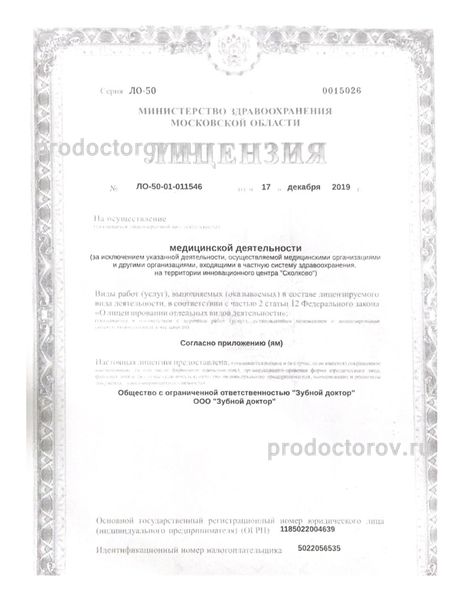 Успешная работа стоматологии «Зубной доктор» складывается из следующих составляющих: высокой квалификации специалистов, использования передовых типов оборудования, внедрения инновационных технологий. Руководит коллективом главврач Боташев Р. А. Организация функционирует без выходных, с 9:00 до 21:00.