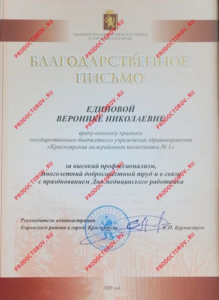 Единова Вероника Николаевна, Красноярск: онколог, маммолог, онколог-маммолог, 1 отзыв пациентов, места работы, стаж 4 года, запись на приём ☎ +7 391 216-87-36.