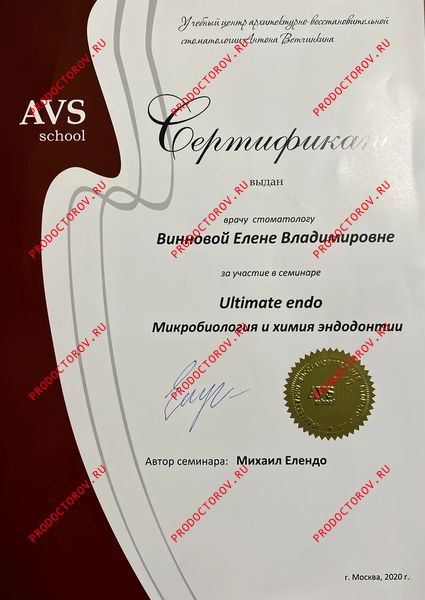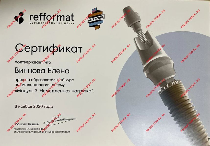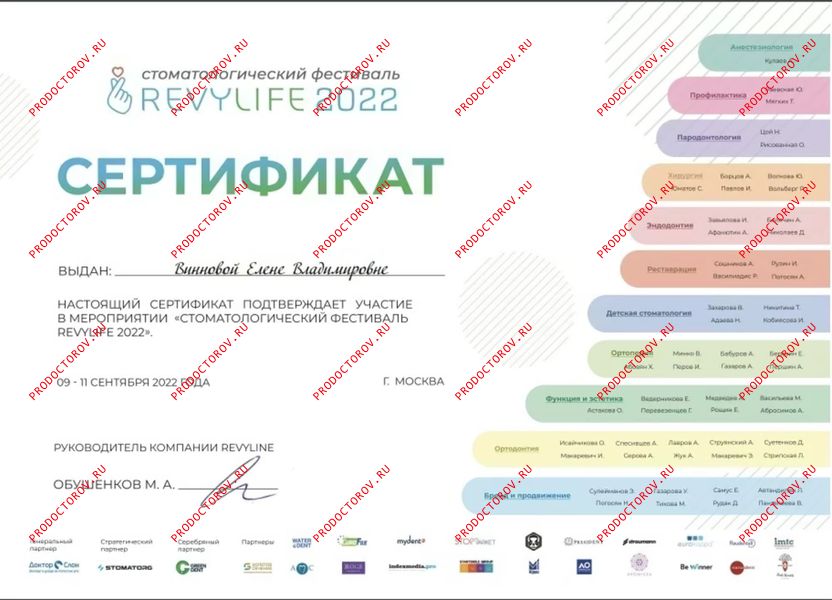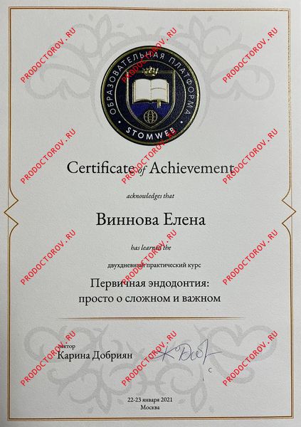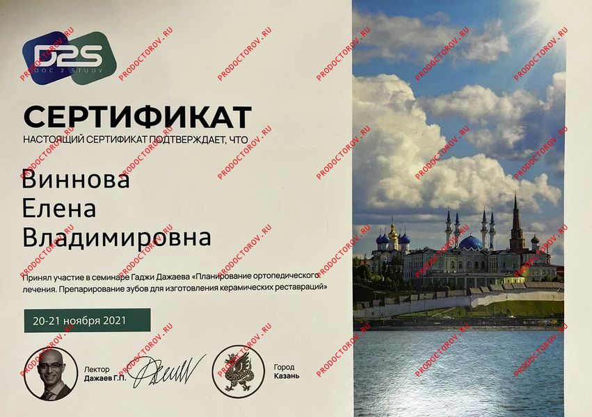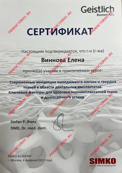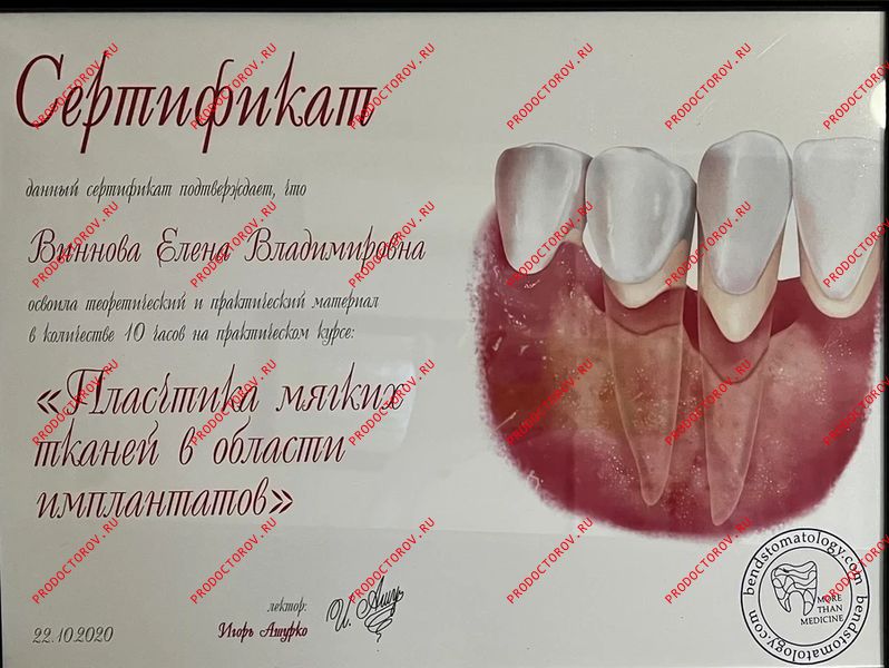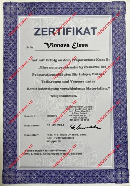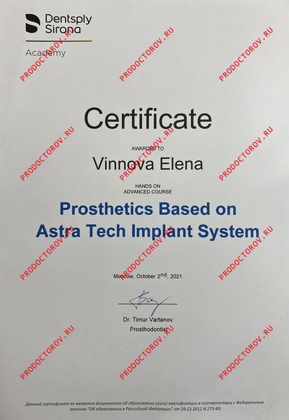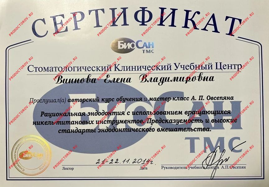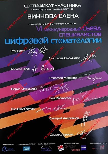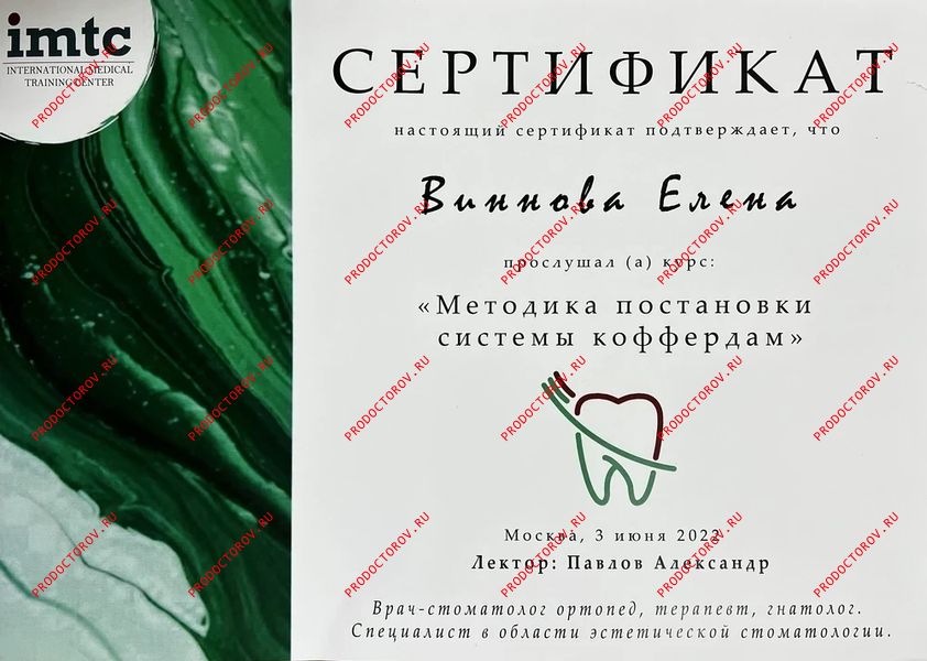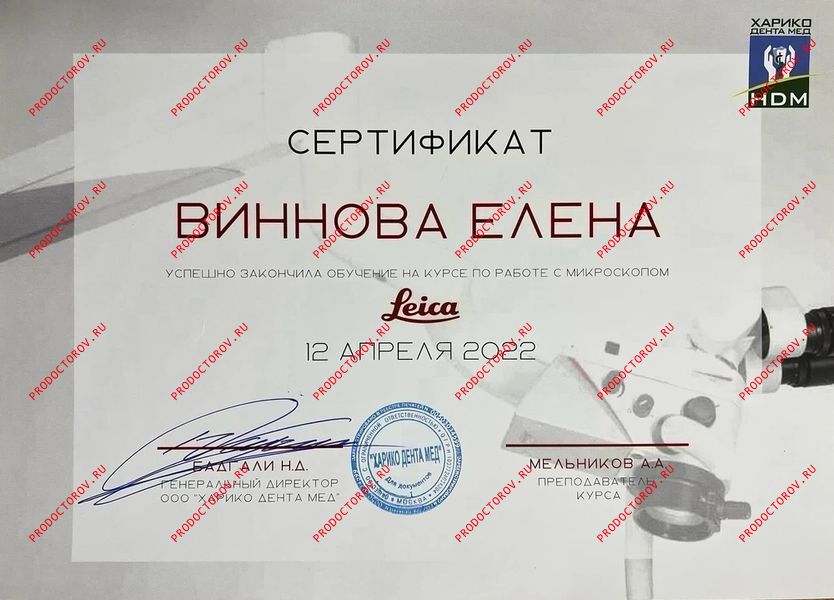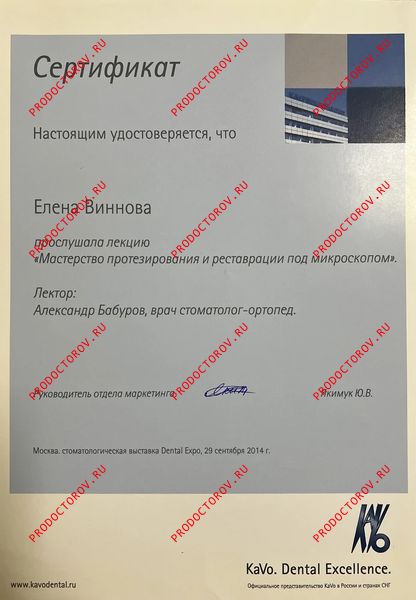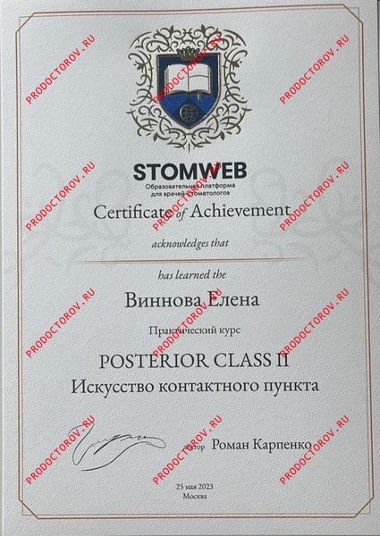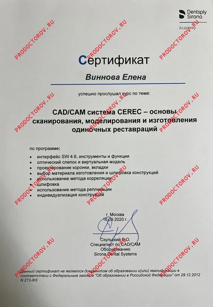 “С Еленой Владимировной мы сотрудничали с 2012 года, и за это время она зарекомендовала себя как профессионал высокого уровня, обладающий глубокими знаниями и искренним вниманием к каждому пациенту. Особенно хочу отметить её компетентность в области микропротезирования с использованием системы CEREC. Елена Владимировна не раз оказывала мне ценную помощь и давала практические советы по данной технологии. Уверен, что любой пациент, обратившийся к Винновой Елене Владимировне, может рассчитывать на внимательное отношение, профессиональный подход и высокий уровень стоматологической помощи.”
