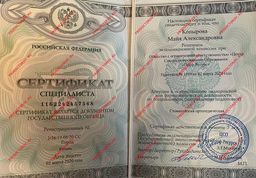 Сертификат стоматология терапевтическая