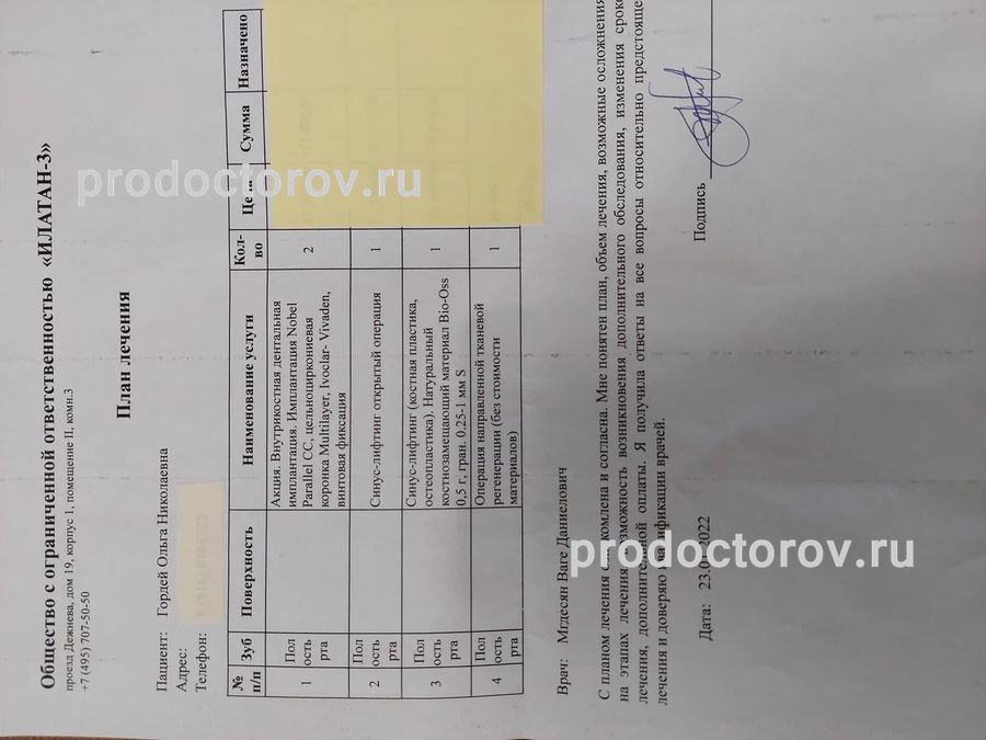 По совету своей дочери обратилась в стоматологическую клинику "Илатан" на Дежнёва, 19. Хотела установить имплантат на верхнюю челюсть и удалить зуб. После консультации в четырёх клиниках остановила свой выбор на этой. Мне очень повезло с врачом. Мгдесян Ваге Даниелович очень позитивный и доброжелательный доктор и очень знающий. Стоимость лечения была подобрана по минимуму. В других клиниках все было раза в 2 дороже. Установка имплантатов и костной ткани прошла успешно, несмотря на мои болячки. В ноябре Ваге Даниелович записал меня уже к другому доктору на установку коронок. Прошло 6 месяцев. Большое спасибо Вам, Ваге Даниелович!