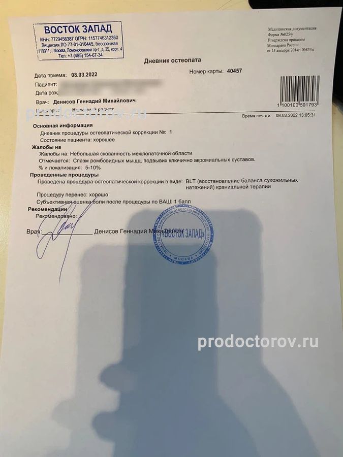 Приём прошёл хорошо, мне всё понравилось. Денисов Геннадий Михайлович - грамотный специалист, он всё объяснил и произвёл остеопатическое лечение. При выполнении манипуляций врач действовал аккуратно и комфортно для ребёнка. С собой мы приносили рентгеновские снимки, которые доктор внимательно изучил и прокомментировал. Медикаментозного лечения в нашем случае не требовалось. Визит состоялся без задержек и продлился 20 минут. В нашем случае этого было достаточно, врач никуда не торопился. Мы планируем вернуться к данному специалисту для продолжения лечения, а также при необходимости будем советовать его другим людям.