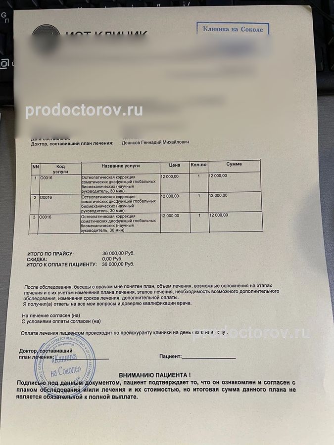 Доктора Денисова мы посетили впервые. Сначала при выборе я ориентировалась по совету другого врача, а потом ещё смотрела в интернете отзывы. Ранее читала, что остеопаты после посещения могут посоветовать какую-то поддерживающую гимнастику, направленную на проблему, с которой обратились, вроде как обычно так делают. А тут хотелось бы получить такие комментарии, чтобы понимать, как после себя вести. Но нам ещё раз надо будет посетить врача, возможно тогда это и будет.