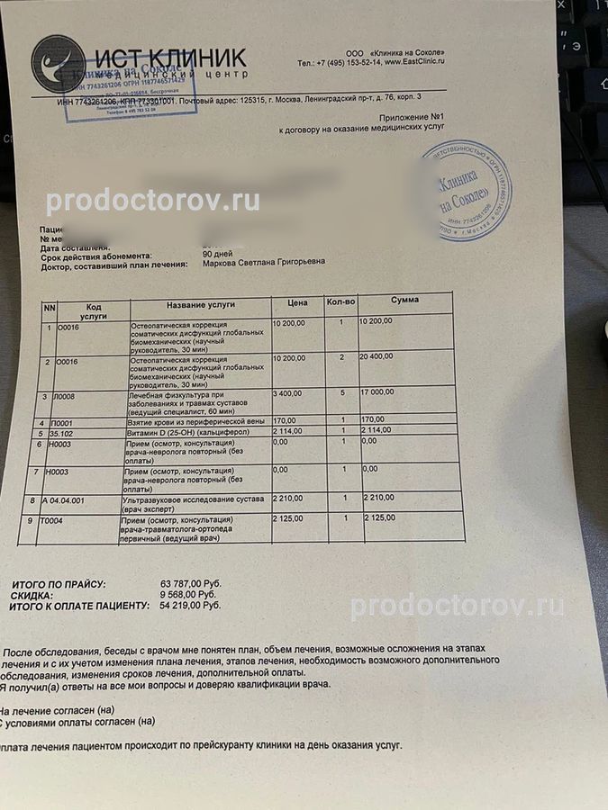 На приём пришли с жалобами, связанными с плохим сном малыша, не любит лежать на животе. Насколько я могу судить, есть некоторое отставание в двигательном развитии, ровно не держит голову. Как я поняла, по УЗИ проблема оказалась в 3 и 4 позвонке. Помню, услышала, что остеопат решит это. При приёме у остеопата он дал понять, что нужно минимум 3 сеанса, а после первого сеанса, мол, точно улучшится сон и все проблемы от неровностей черепа. Помню, услышала, что оплата 50% от суммы трех приёмов около 15000 р. Прошло около месяца, по моим наблюдениям, после первого приёма ничего не изменилось. В связи с этим решила поделиться нашим опытом. За такую цену приёма, на мой взгляд, должен быть результат, и вообще осталась в недоумении.