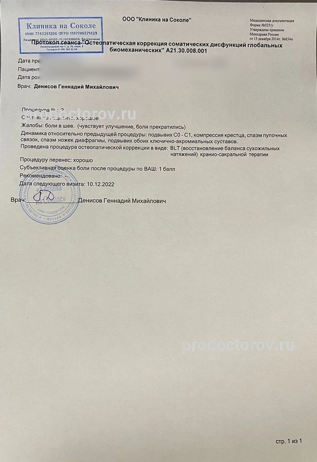 Я обратилась к доктору Денисову Г.М. с болями в спине, шейном отделе, поясничном отделе. Доктор выполнил 3 сеанса остеопатии (остеопатическая коррекции соматических дисфункции глобальных биомеханических). Результат стал очевиден уже после 2 сеанса - боли прекратились, а после 3 стала чувствовать себя великолепно.
