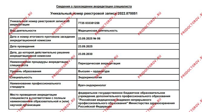 Прием (осмотр, консультация) врача-эндокринолога, кандидата медицинских наук, врача высшей категории, ведущего специалиста, первичный