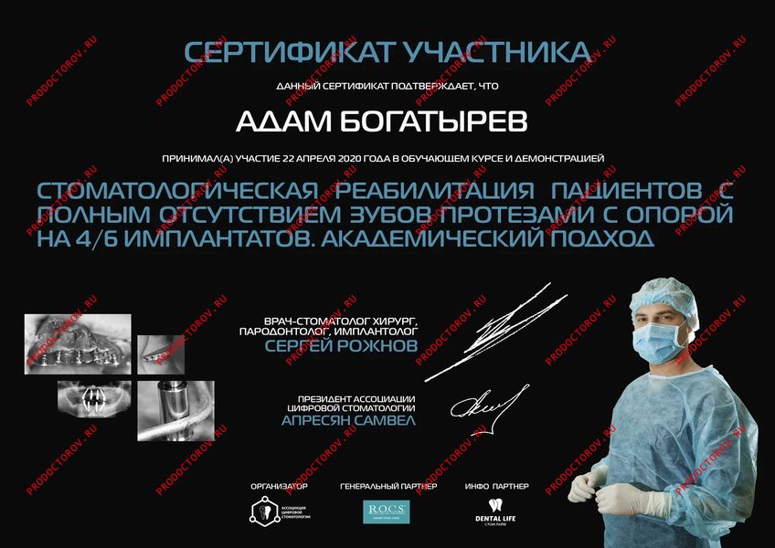 “Специалист своего дела, с которым мы сотрудничаем не первый год. Врач, способный видеть клиническую картину в целом, учитывая не только аспекты своего профиля ортопедии, но и смежных сфер (терапии, хирургии, ортодонтии). Все это является основой для правильного взаимодействия команды врачей и комплексного подхода к лечению. Особенно при планировании тотальной реабилитации пациентов!”
