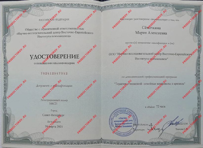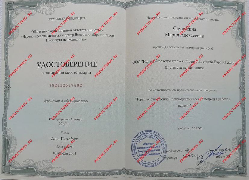 «Семейная психотерапия и консультирование супружеских пар», Восточно-Европейский Институт Психоанализа, г. Санкт-Петербург