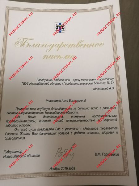 Благодарственное письмо губернатора Новосибирской области