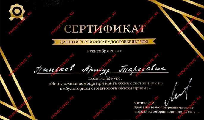 Благодарим за положительный отзыв о работе врача стоматолога-хирурга-имплантолога Артура Тарасовича Панькова.