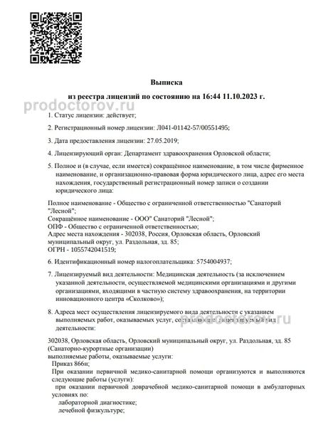Санаторий «Лесной», Орёл: 10 врачей, 17 отзывов о клинике и ее врачах, телефон, официальный сайт, адрес - Орёл, ул. Раздольная, д. 85.