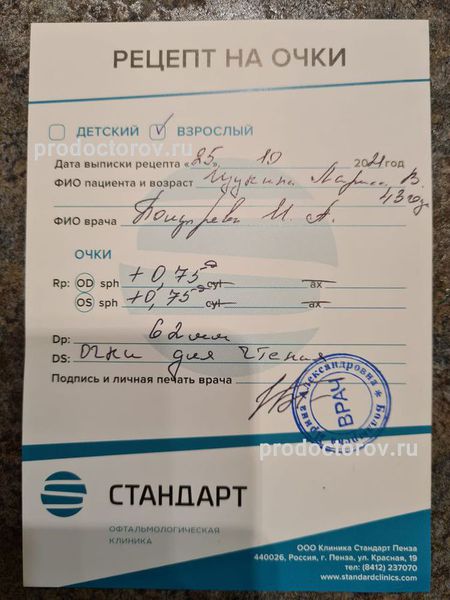 Я ношу очки с 4 класса. Поискала клиники и по отзывам понравилась клиника «Стандарт». Записалась в начале на полную консультацию перед лазерной коррекцией. Прием состоялся вовремя. Провели осмотр на всех аппаратах. Было выявлено небольшое отклонение в сетчатке. Врач предложил сделать сразу операцию лазером на сетчатку, чтобы в будущем я смогла сделать коррекцию. Все объяснила, на все мои вопросы ответила. Сама операция заняла 5-8 минут. Болевых ощущений не было вообще! После операции дали капли и все рекомендации. Понравилось то, что операцию сделали в этот же день. Для меня это важно, так как я из другого города. В общем, клинику советую!