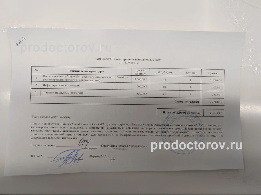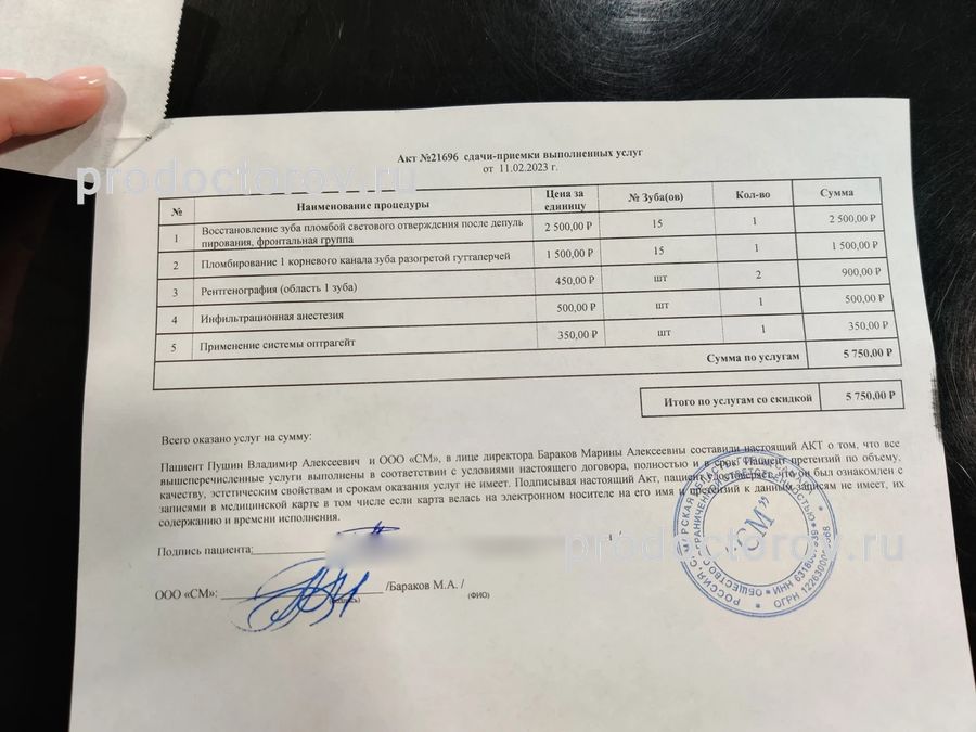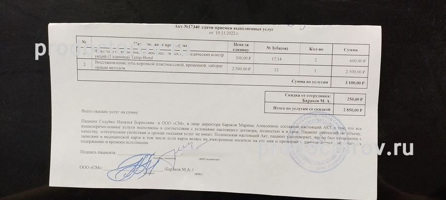 Изначально пришла на консультацию с жалобами на конкретный зуб, принял меня доктор Бараков Ян Робертович. Сделали КТ​, назначили план лечения (вылечить два кариеса​, сделать профгигиену). Вместе с врачом подошли к администратору записаться на прием, где мне врач предложил две процедуры сделать сразу - гигиену и лечение кариеса​. Я записалась на время и к доктору, которого предложил мне администратор. Запись приема была в [...], далее мне пришло СМС-оповещение с подтверждением записи, где время сменилось на [...], по факту доктор Шим Михаил Сергеевич меня принял в [...]. На приёме доктор спросил: «Будем лечить кариес?», на что я ответила, что да, и профгигиена, так как меня так записали. Он сказал, что две процедуры не успеем, и необходимо выбрать одну, я выбрала лечение зуба. Напомню, что я приходила с жалобой на конкретный зуб, доктор предложил начать с более простого зуба, на что я сказала, что болит и беспокоит меня другой. И тут врач начал [...] мне чувство вины и ставить меня в неудобное положение, говоря о том, что зуб сложный, его лечение займет много времени, и что я тем самым задержу всю клинику. Но моя позиция простая - есть запись, будьте добры, окажите услугу. Доктор согласился лечить тот зуб, который беспокоит, но на протяжении всего лечения продолжал монолог о том же, как это долго, как это я неправильно записалась, что я всех задерживаю. Мне еще никогда не было так напряженно в кабинете у врача. После завершения процедуры я опять выслушала о том, что нужно на сложные зубы записываться днем, выделять для них больше времени, что мы, пациенты, не понимаем объема работ. Почему врач вообще позволяет себе так отчитывать пациентов? Хотя я ему объясняла, что я была на консультации в Вашей же клинке, и врач меня так записал, а не я сама. Ужасное, хамское отношение, любое высказывание со стороны врача - высокомерное и надменное. Испортили все впечатление от клиники, больше никогда не приду.