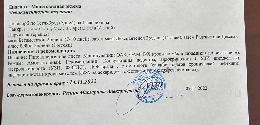 Пришли на приём с 6-месячным сыном. Проблема: сыпь на ягодицах и спине. Врач взяла анализ​ и затем назначила лечение. Особое внимание хочется уделить направленности лечения. До этого педиатры в один голос, даже без анализа сказали, что вся проблема в питании матери и нужна диета. Благодаря Резник М. А. обошлись без диет и сохранили нервы маме. ☺️ Сыпь прошла через 3-5 дней.