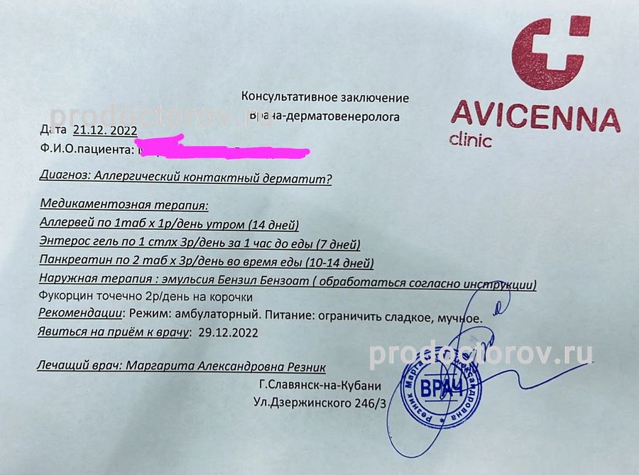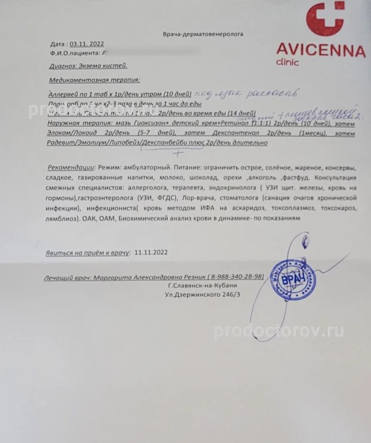 Понадобилась консультация дерматолога, знакомые посоветовали Резник Маргариту Алексадровну. Оказалось, что помимо кожно-венерологического диспансера, она принимает в частной клинике "Avicenna". Это удобно, потому что у меня нет возможности отпроситься с работы, а клиника работает до 19:00 час. Удобное расположение - тоже плюс, рядом находится остановка, центр города. Встречают тепло и дружелюбно. Помещение светлое, уютное. Персонал вежливый. Маргарита Александровна сразу расположился к себе приятной улыбкой. Внимательно выслушала, задала вопросы, тут же взяла необходимые анализы​. Стоит отметить, что Маргарита Александровна ладит с детьми, что немаловажно в её работе. У меня ребёнок уже довольно взрослый (11 лет), ему уже не страшно ходить к врачу [...]. Через день были готовы анализы. На повторном приёме Маргарита Александровна расписала курс лечения, подробно рассказала о каждом препарате, как его принимать, с чем можно совмещать. При появлении жалоб рекомендовала немедленно звонить ей для корректировки лечения.
