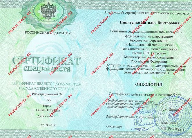 Прием (осмотр, консультация) врача-онколога первичный, врач Никитенко Н.В.