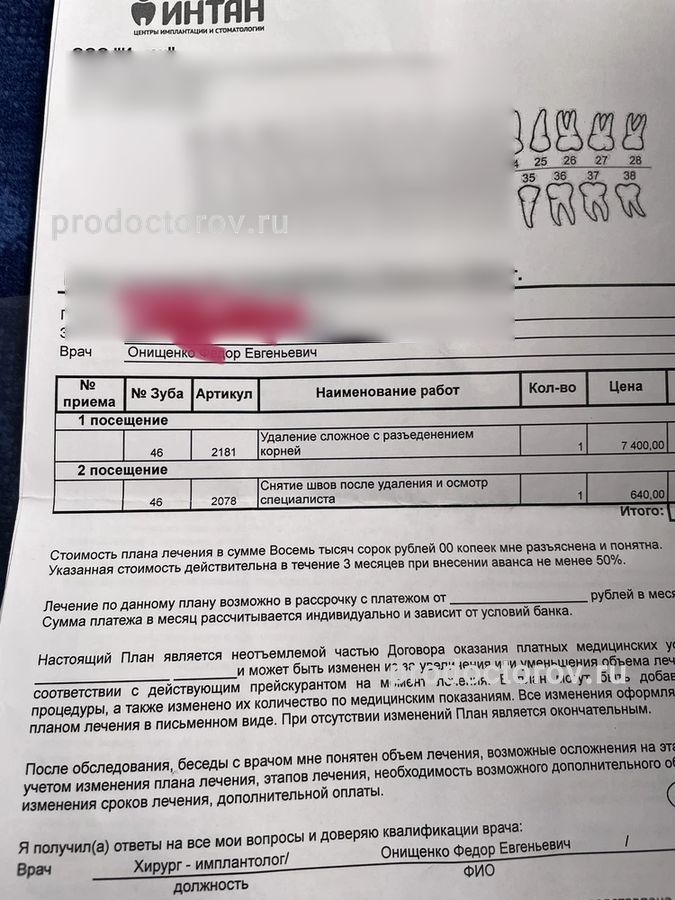 В «Интан» я обращалась к ортопеду. Была в клинике в первый раз, к сожалению, фамилию доктора не помню. Приняли меня вовремя, сразу как я пришла. Консультация длилась примерно полчаса. Понравилось, что со мной очень вежливо и даже ласково разговаривали. Я была очень расстроена сама по себе и из-за зубов, но меня осмотрели, успокоили и сказали, что сделают всё необходимое, мы договорились о дальнейших действиях. Меня всё устроило! Я не очень часто хожу в клиники, сравнивать цены не с чем, но в принципе, я и так знала, что такие услуги достаточно дорогие, поэтому спокойно отнеслась к озвученным ценам. В «Интан» очень уютно, чистенько и тихо, на здании хорошо видна вывеска с названием стоматологии​. На следующей неделе собираюсь вернуться в клинику, пока буду проходить обследования. Вопросов у меня нет, пока что всё было хорошо.