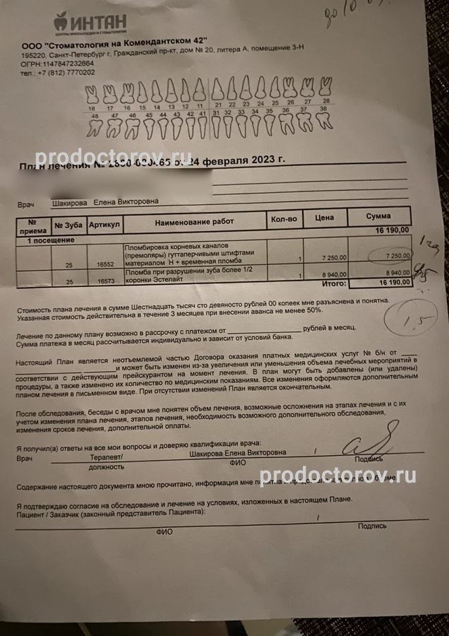 Отзыв о докторе Шакировой Е. В. 24 февраля я впервые пришла на прием в клинику "Интан". Первые впечатления о Елене Викторовне были хорошими. Врач была вежлива и деликатна, аккуратно поставила укол​, дала рекомендации по уходу за моими сложными зубами... Дальше будет негативная [...] часть отзыва. Перед приемом Елена Викторовна не составила план лечения, не уведомила об окончательной стоимости услуг. Ошарашила высокой ценой после лечения, [...]. На мои вопросы о том, почему такая цена, и реакции крайнего удивления, врач сказала: "Вы так уверенно сели в кресло, я думала, вы все знаете", "[...] в другой клинике, там такое лечение вышло бы еще дороже, где вы видели цены ниже?". Не комментирую подобное отношение врача и искренне надеюсь, что это единичный случай. Также, во время лечения не был использован коффердам, я весь прием ощущала себя, как в стоматологии​ эконом-класса или поликлинике, не понимая причины: а все просто, пыль и вкус хлора не могли дать иного результата. А когда мне выставили счет в 33 тысячи за лечение пульпита​ одного зуба, я оказалась еще больше удивлена качеству оказанных услуг. Мало сказать об этом, после наркоза боль стала невыносимой, изначально я думала, что это реакция на лечение, но знакомые сказали срочно обращаться в клинику, так как появился отек и острая боль не стихала. Я обращалась с жалобой на отсутствие адекватного плана лечения в клинику, сегодня, 28 февраля, меня приняли, помимо вышеуказанных проблем обнаружилось, что у меня в зубе не 2 канала, как лечила Елена Викторовна, а один, изогнутый, в связи с чем была пропущена часть нерва, которая и болела. Учитывая, что я нахожусь в положении, эта боль очень тревожила меня, но благодаря работникам клиники, которые исправили эту ошибку, сегодня я смогу спать спокойно.