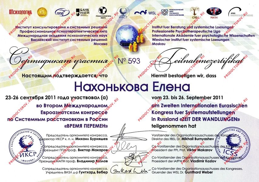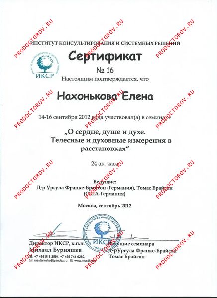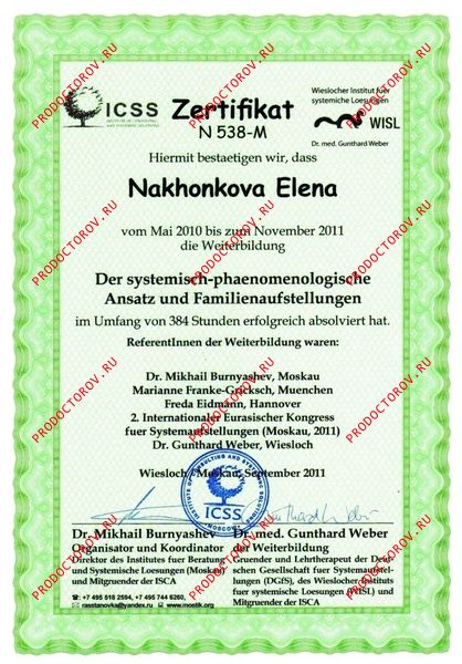 Проходила обучение по методу системных расстановок у российских и европейских мастеров в том числе у Берта Хеллингера, основателя метода, Софи Хеллингер, Гюнтхардта Вебера, человека позволившего методу вырасти до известного и популярного, Михаила Бурняшева - открывателя пространства в России для расстановок и многих других уникальных и замечательных мастеров. Начиная с 2006 года имею практику в данном подходе.