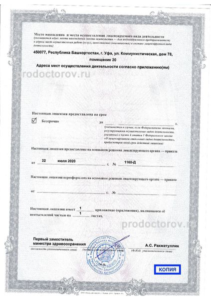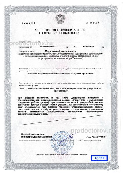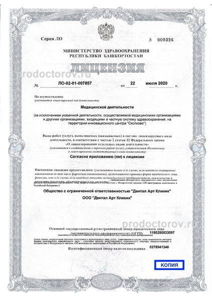 В штат стоматологии «Артиум Дентал Клиник» входят тщательно подобранные специалисты, имеющие за плечами солидный арсенал профессиональных навыков и многолетний опыт работы по профессии. Деятельность организации осуществляется в соответствии с требованиями, предъявляемыми лицензией от 22 июля 2020 года.