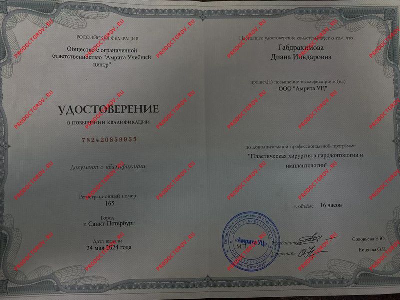 Я выражаю свою благодарность хирургу-пародонтологу Габдрахимовой Диане Ильдаровне за профессионализм, чуткое, внимательное отношение. Не первый раз обращаюсь к этому замечательному специалисту. И нынче делала гигиеническую чистку полости рта. Всегда получаю не только высокопрофессиональную помощь, но и дельные рекомендации по домашнему уходу за полостью рта. Легкая рука, доброжелательность, качество оказываемых услуг всегда на отлично! К таким специалистам есть желание возвращаться вновь и вновь и рекомендовать своим знакомым.