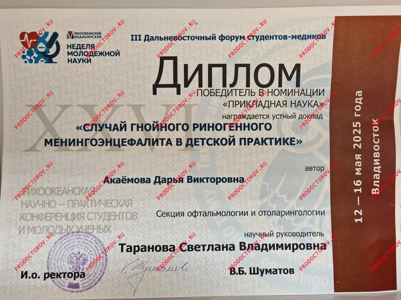 Победитель в номинации прикладная наука за доклад "Случай риногенного менингоэнцефалита в детской практике"
